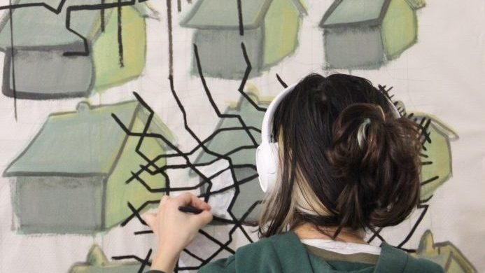 Andréa Grasso is a muralist with a diverse background as a curator, project leader, and designer. Grasso is interested in all forms of socially-engaged processes, didactic art, and cross-disciplinary collaboration. In some more recent mural projects, Grasso has created large-scale translucent vinyl mosaic installations on window facades, expressing an interest in experimenting with light and shadow.